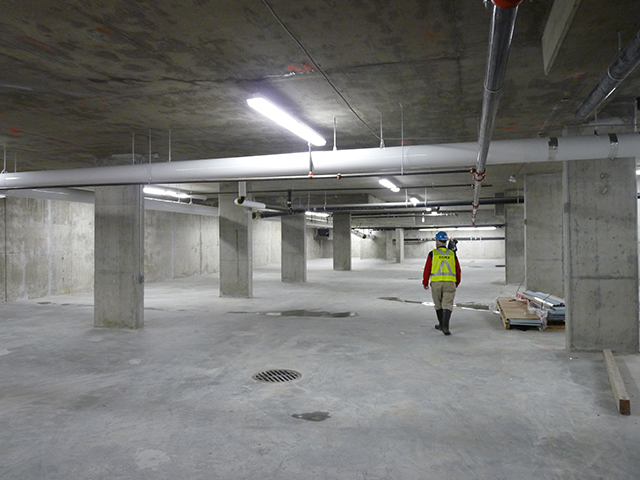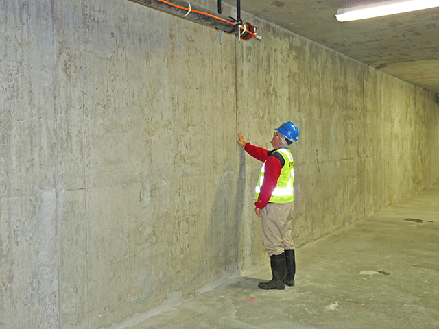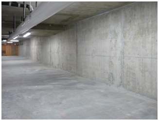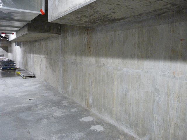 Located at 428 Terminal Avenue, this 5-storey office building has one level below grade parking structure and is built in the False Creek area of Vancouver. This area is just slightly above sea level and is just adjacent to the end of the False Creek inlet. As such, due to its location and the climate of the lower mainland of British Columbia, the underground structure is exposed to ongoing contact with water under moderate hydrostatic pressure. The below grade waterproofing is done using Xypex Concrete Waterproofing by Crystallization only. There is no membrane, drainage layer, or drainage assembly used. Further details are as follows: Xypex Admix C-500 was added to approximately 500 m3 of concrete at a dosage of approximately 2% of the cement for the below-grade exterior walls and slab. This includes the concrete for the elevator pit. The mix was a standard 30 MPa fly ash mix. The exterior walls were landed on the slab and the walls had 1” x 1” (25 mm x 25 mm) square profiled preformed control joints spaced approximately every 20 ft. These construction joints had a PVC waterstop installed to waterproof the expected crack locations. The profile was chosen to allow easy installation of Xypex Patch’n Plug and Concentrate at any of these joints that might leak. Additional cracks formed in the walls between these control joints most of which did not leak or initially leaked and self healed with Xypex over time. Several cracks that did not self heal were chipped and packed per Xypex crack repair methods. The wall slab interface was poured with a first 4”- 8” lift of Xypex admixture modified grout to ensure a well consolidated wall / slab interface. The wall / slab interface has a PVC waterstop and also had installed a slurry coat of Xypex Concentrate at the interface of the wall and slab. A Xypex seal strip of approximately 1” x 1.5” preformed on the inside at the wall / slab interface and was packed with Xypex Concentrate after the concrete was hardened. There was very good concrete consolidation and no leaking at the wall / slab joint. As can be seen from the photographs the concrete and all joints are dry and leak free. The people involved with the project are happy with the waterproofing performance of the Xypex materials used in this below water table foundation.